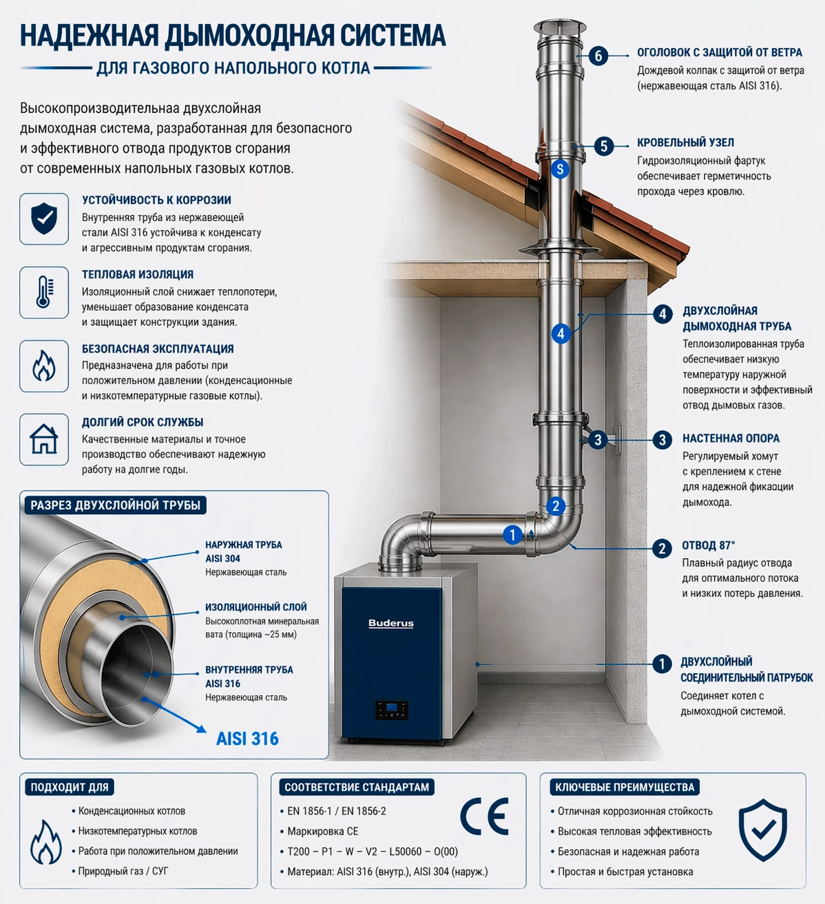 - Используйте только нержавеющую сталь нужной марки (дымоход-сэндвич AISI 316L (или AISI 444) — для конденсационных котлов, AISI 304 — для обычных).
